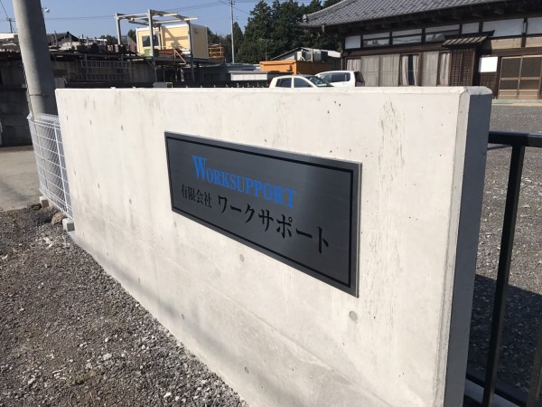 現場を確認し、門柱の左側に取り付けることで会社名が最も認識されやすい位置を選定。